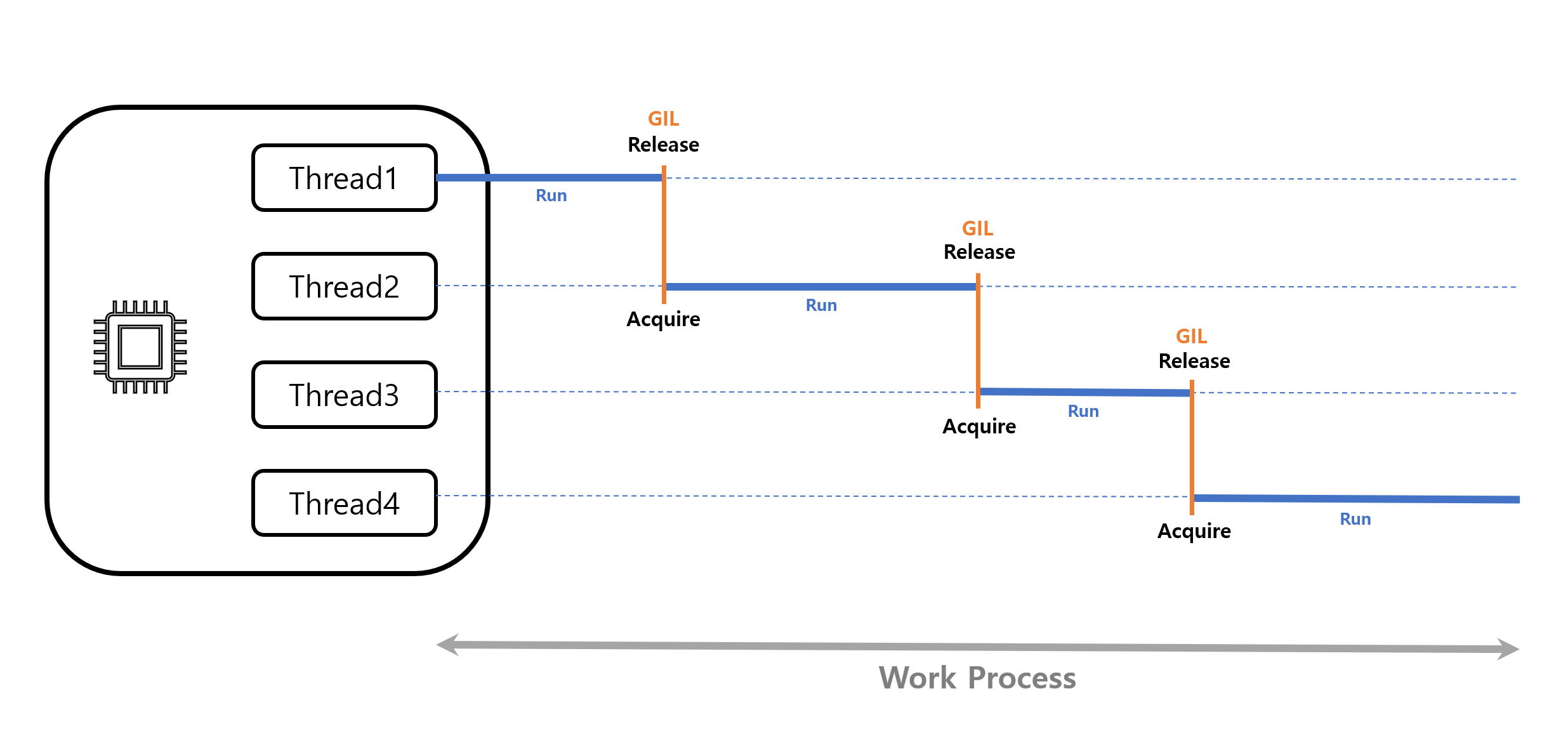 여기서 Multi-Threading 방식을 통하여 한 객체에 동시 다발적으로 접근을 하게 된다면 참조 횟수를 통한 문제가 생길 수 있고 이는 레이스 컨디션(Race Condition)를 야기하여 GC의 부적절한 결과를 발생 시킬 수 있기 때문에 GIL을 통해 객체에 접근하는 쓰레드를 제한하는 것이다.