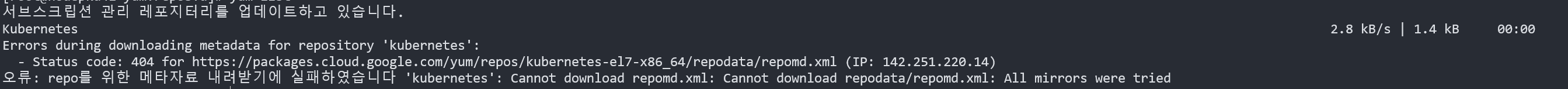 내용으로 보았을 때, 쿠버네티스 패키지를 설치하기 위해서 등록했던 쿠버네티스 레포지토리를 찾을 수 없어서 404 에러를 반환하였고, 이로 인하여 yum을 이용한 어떠한 패키지도 설치할 수 없었다.