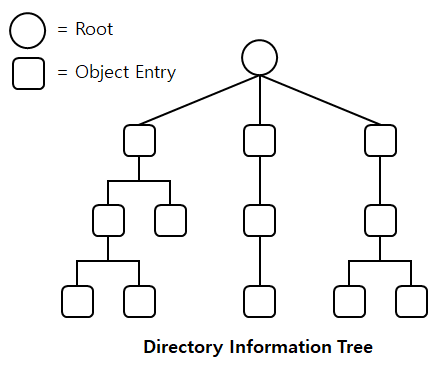 LDAP은 사진에서 보는 것 처럼 계층적인 트리 구조를 가지고 있고, Root에서 뻗어 난 각각의 Leaf를 Entry라고 한다.