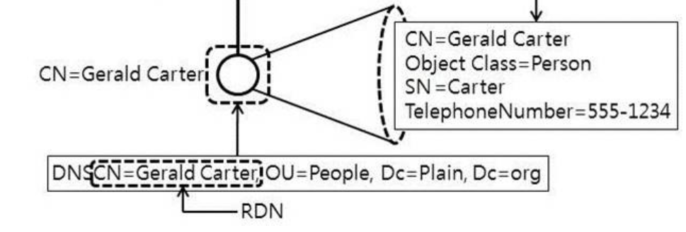 기업의 각 사용자와 그룹은 고유 이름(DN) 속성으로 나타내는데, DN은 연결된 사용자, 그룹 또는 객체에 대한 식별 정보가 있는 문자열이며, 각 Entry는 DN으로 구분할 수 있다.